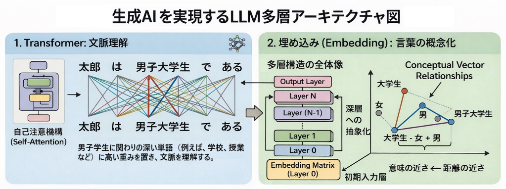 この知能を支えているのが**ディープラーニング(深層学習)**です.これは人間の脳神経を模した学習アルゴリズムで,画像や音声だけでなく,「言葉」が持つ複雑な意味や文脈までをもコンピュータが扱える形(特徴)として自動的に学習(表現学習)します.LLMは,この技術を使って言葉の意味のつながりを深く学習し,人間のような流暢な日本語を操ることができるのです.
